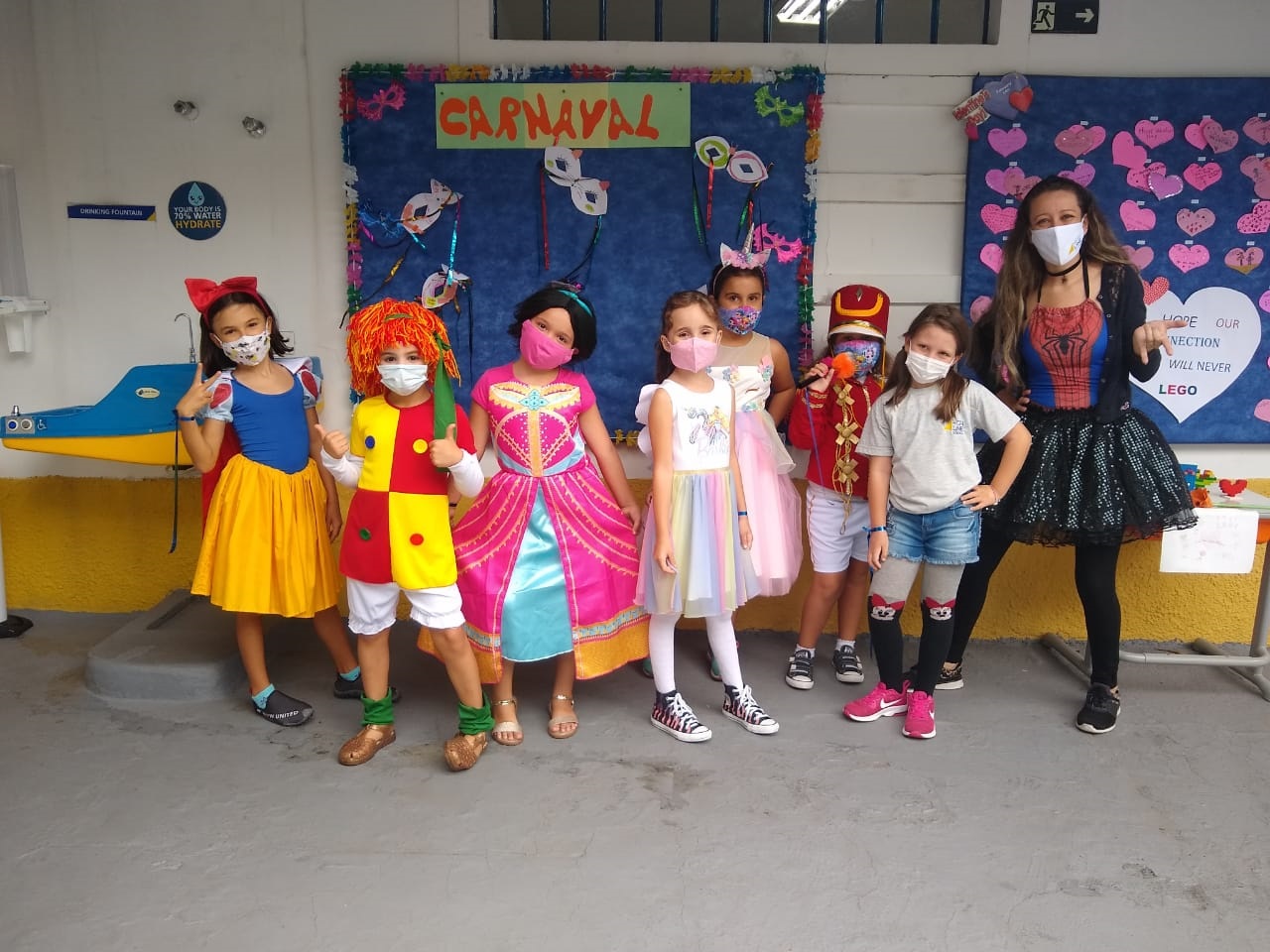 Assim, tanto os alunos que estavam na escola quanto os que acompanharam de casa, não perderam a oportunidade de colocar a imaginação em prática e elaborar um criativo look carnavalesco.